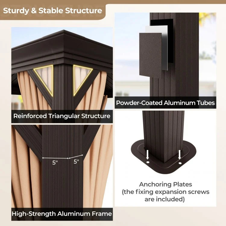 Sturdy and Stable Structure: The double-top gazebo is built with a high-strength aluminium frame and reinforced triangular structures, providing strong support and ensuring good sturdiness. And there exist anchoring plates with pre-drilled holes and expansion screws for easy mounting and fixing, adding extra stability.