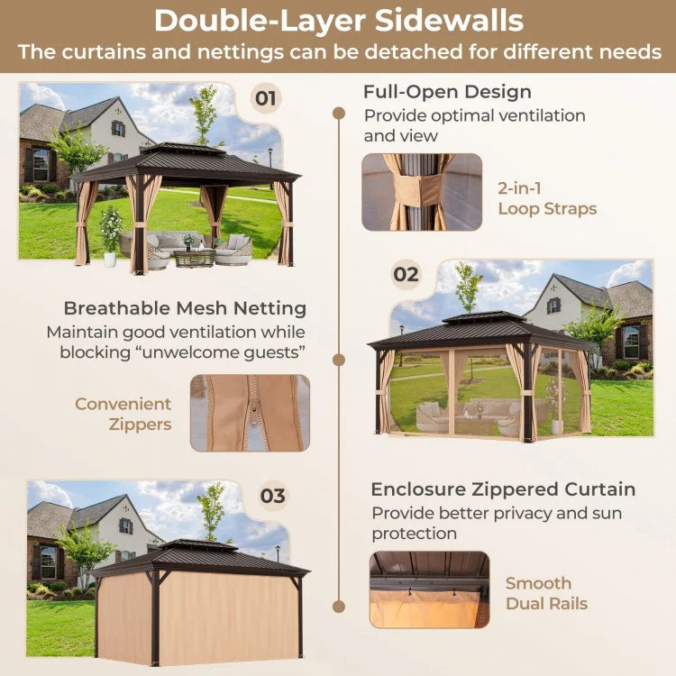 Double Roof Design and Spacious Space: The hardtop gazebo features a double roof design with netting, which promotes good air circulation while improving stability in windy conditions. Besides, it measures 12 x 12 x 9.6 ft (L x W x H), providing large space for outdoor BBQ, dining, friend parties, family gatherings, or daily relaxation.