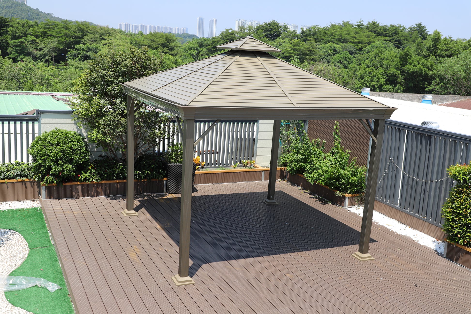 Our aluminium patio gazebo features a weatherproof galvanized steel hardtop, engineered to resist rust, block harsh sunlight, and perform through wind and rain. With excellent load-bearing capacity for snow and robust corrosion-resistant materials, it’s designed for year-round outdoor use with minimal maintenance.
