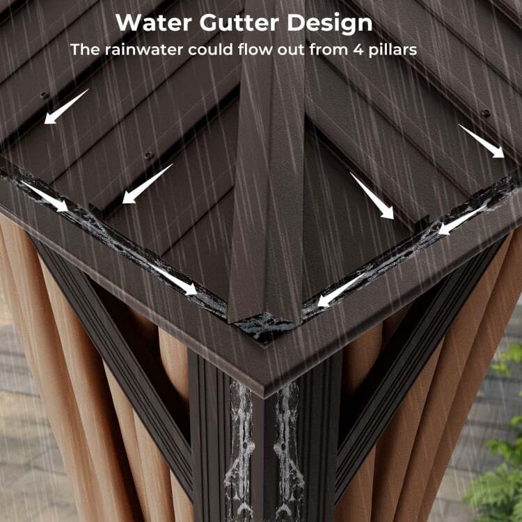 ● All-Weather Galvanized Steel Roof: The hardtop gazebo adopts a heavy-duty galvanized steel roof, which can reduce 99% harmful sunlight on sunny days, withstand heavy rain and wind (up to 30 MPH) on rainy days, and withstand heavy snow load of 1760 lbs on snowy days. Moreover, it features a water gutter design, therefore the rainwater could flow out from 4 pillars.