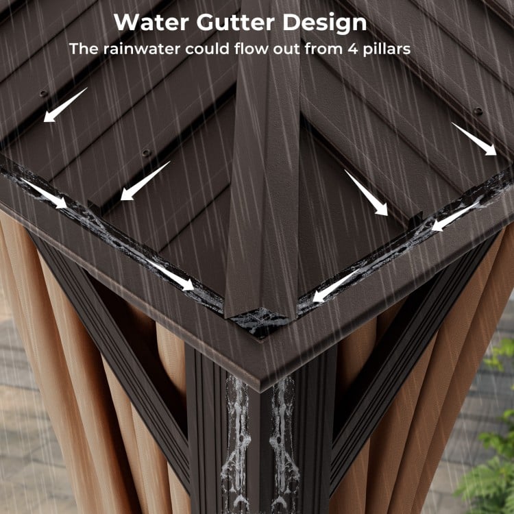 Weatherproof Galvanized Steel Roof: The hardtop gazebo adopts a heavy-duty galvanized steel roof, which is rustproof, sun-protection, and weatherproof. Moreover, it can reduce 99% harmful sunlight on sunny days, withstand heavy rain and wind (up to 46 MPH) on rainy days, and withstand heavy snow loads of 2000 lbs on snowy days.
